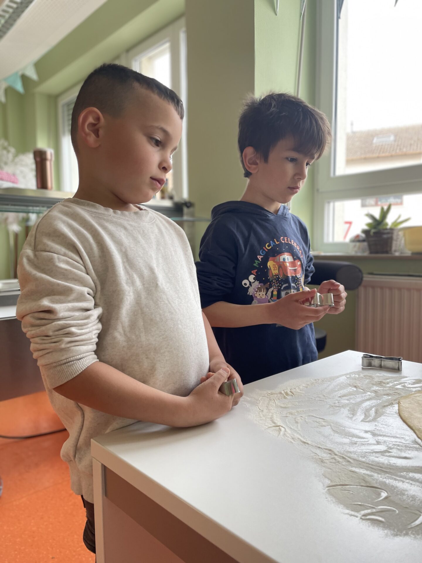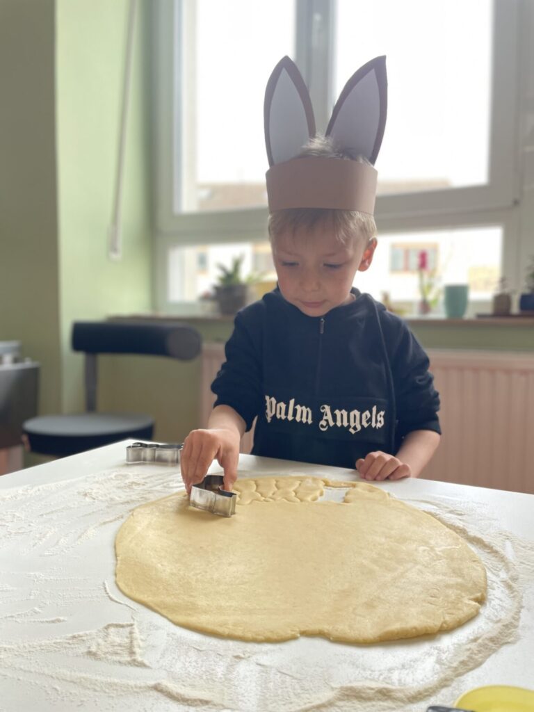 Osterhasen-Bäckerei 16. April 2025Gestern waren die Kinder als Osterhasen unterwegs, um mit Lidwina Kekse in Hasen-, Hahn-, Ei- oder Schmetterlingsform auszustechen, zu verzieren und zu backen.