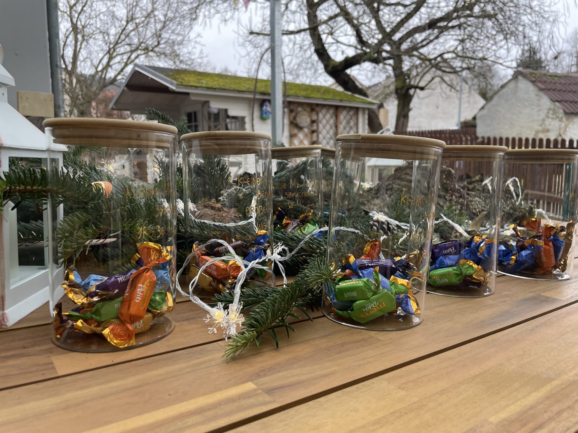 Ein liebevoll gestaltetes Glas mit einer süßen Bonbon-Mischung trug den Spruch: