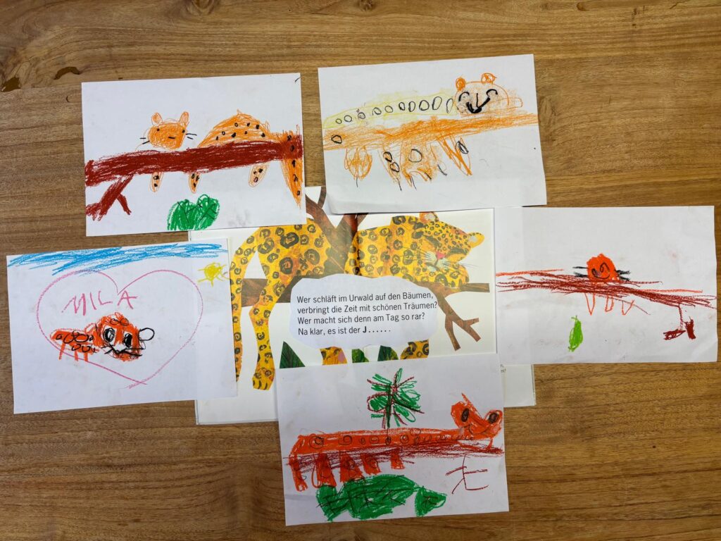 Die Vorschulkinder haben sich im Malatelier gemeinsam ein Bilderbuch angeschaut. Darin ging es um einen lustigen Reim über den Jaguar: