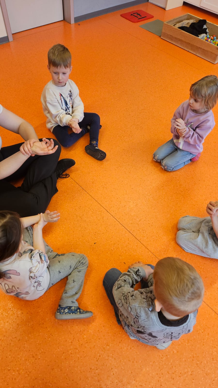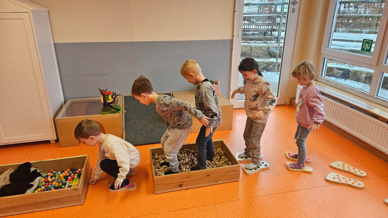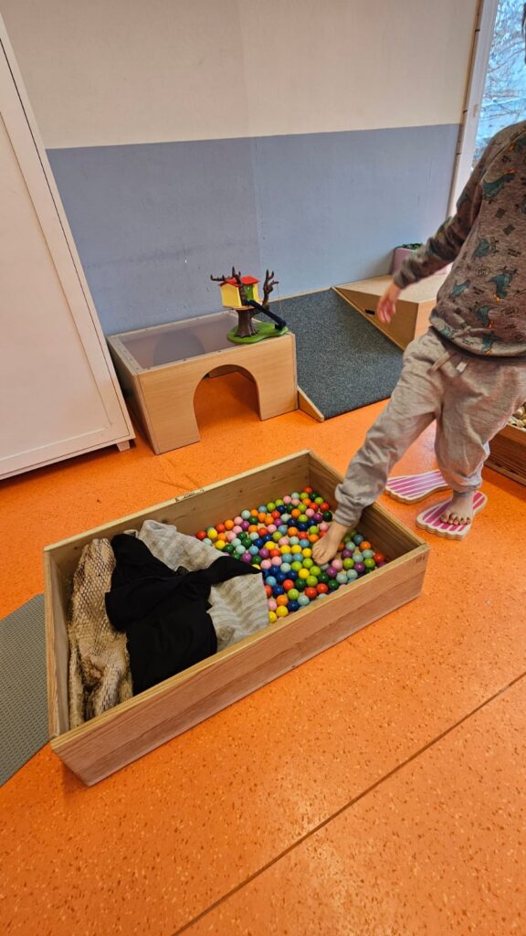 Hier wurde es taktil! Während einige Kinder bei einer sanften Handmassage mit Mandelöl entspannten, erkundeten andere unseren Barfußpfad. Ob „pieksig“, „weich“ oder „glatt“ – unsere Füße haben uns viel erzählt.