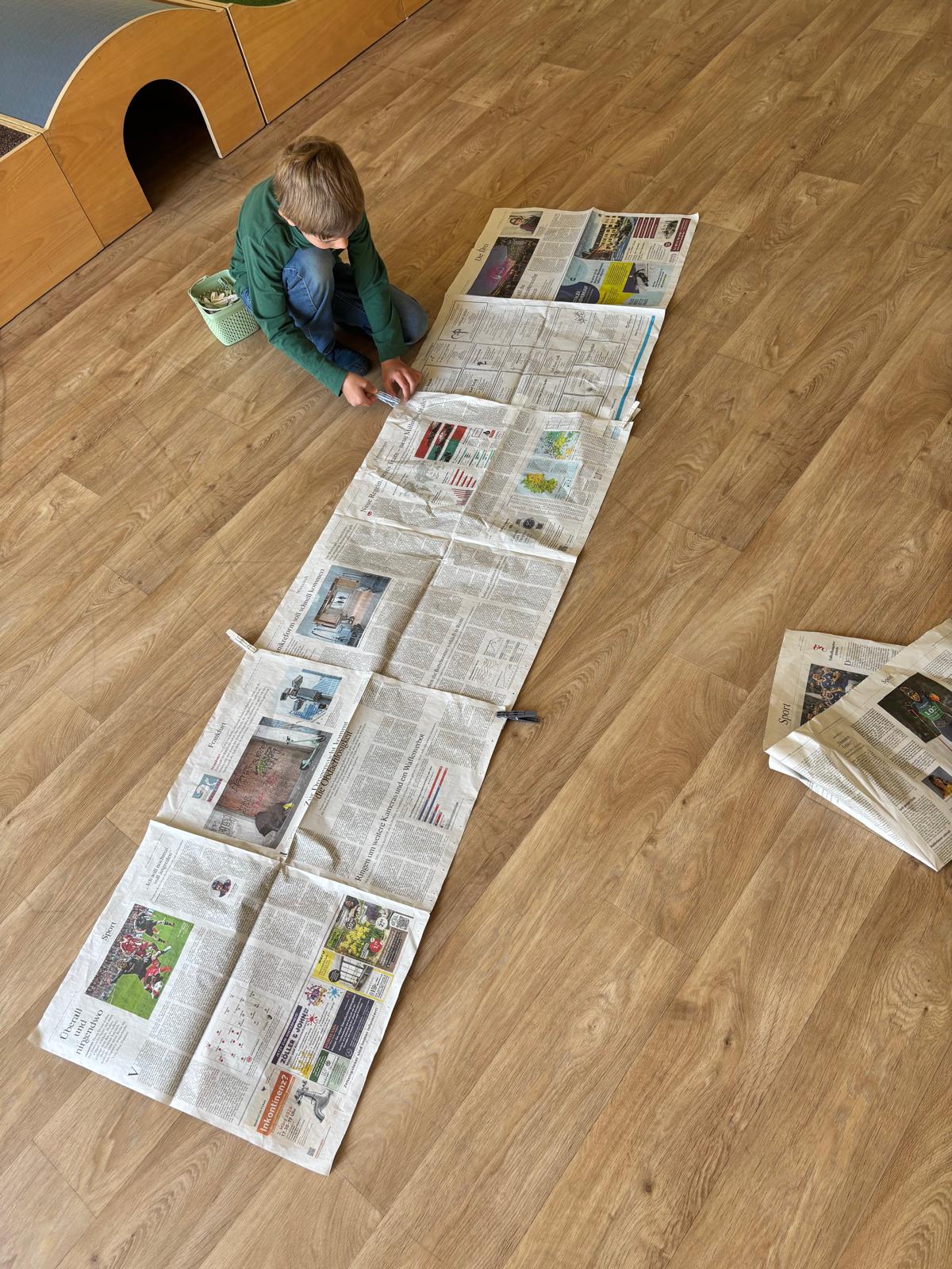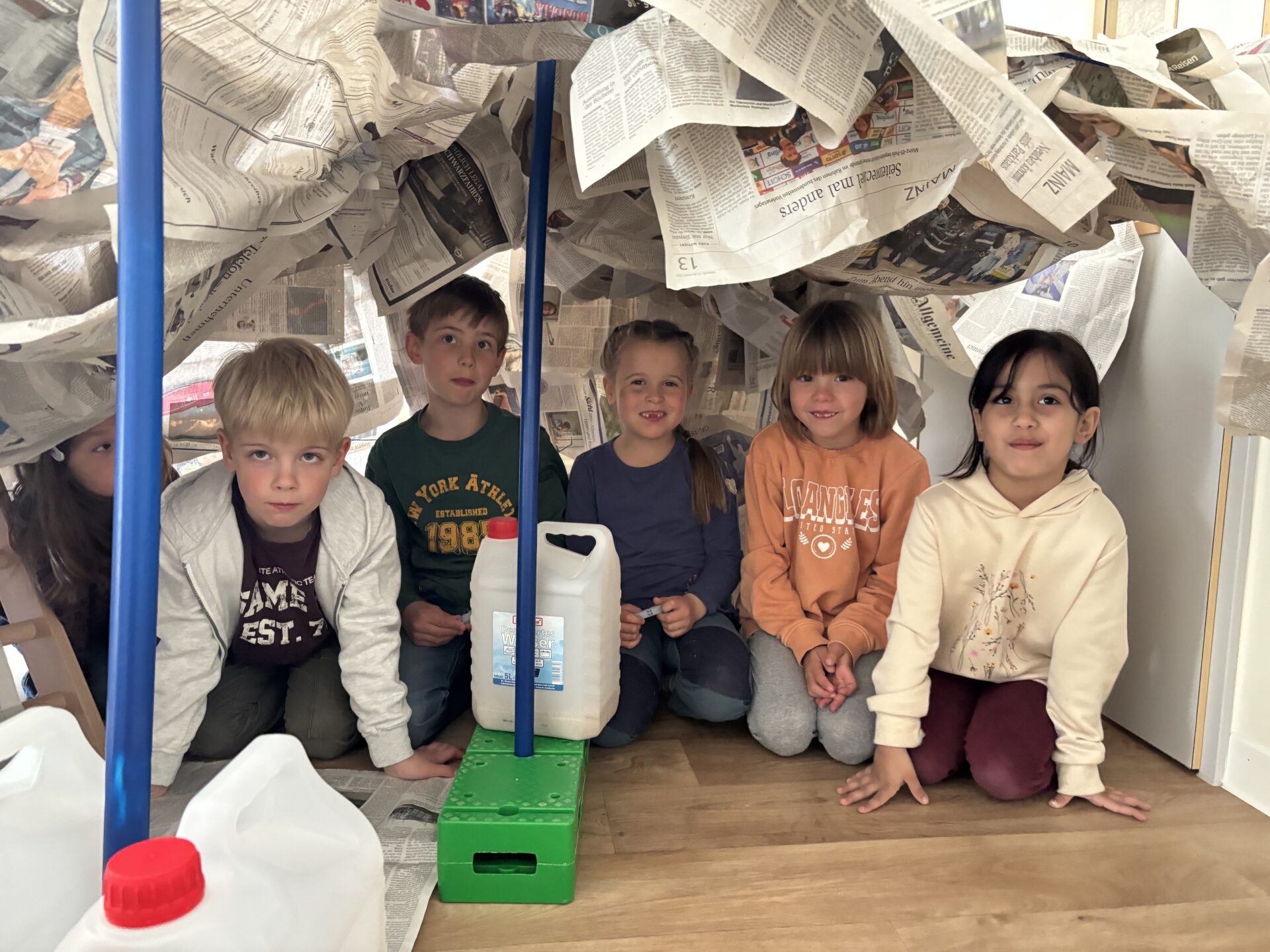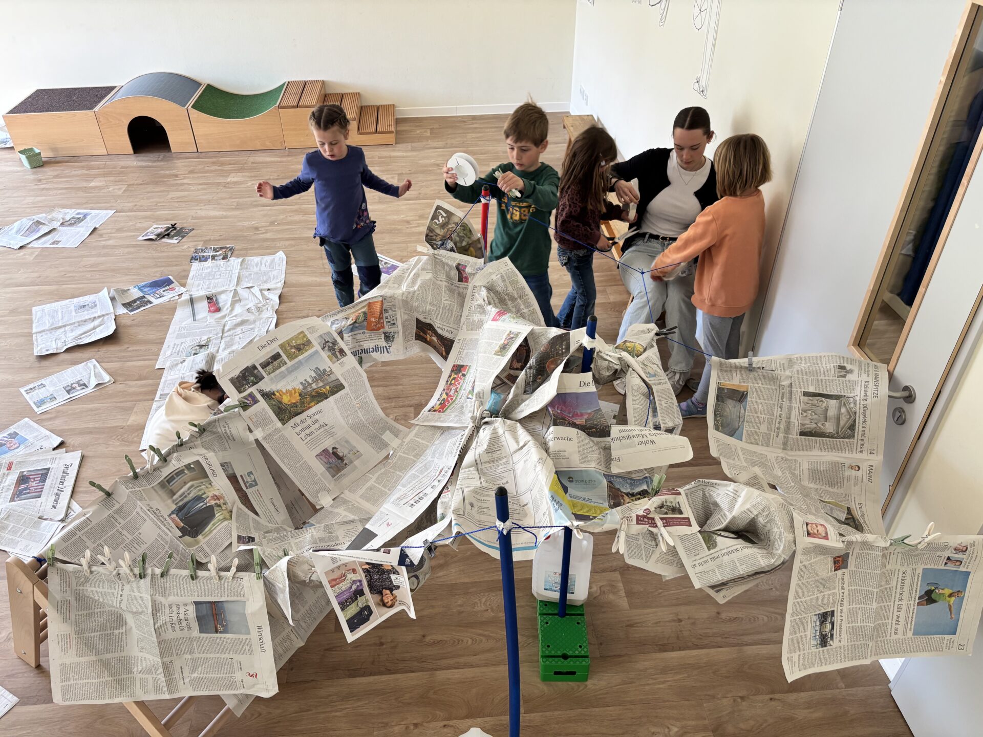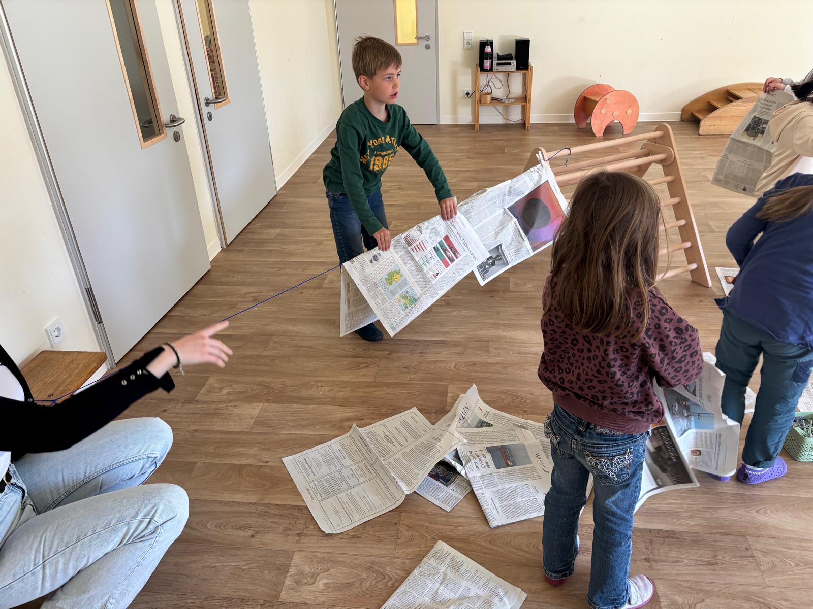 Die Kinder erhielten die Aufgabe, aus Zeitungspapier, Schnüren und Wäscheklammern ein eigenes Zelt zu konstruieren. Dabei ging es zunächst darum, eigene Ideen zu entwickeln: Wie lassen sich Schnüre so spannen, dass eine stabile Konstruktion entsteht? Wie kann die Zeitung als „Zeltplane“ genutzt werden?